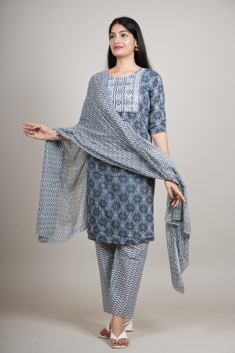 Upgrade your ethnic wardrobe with this Blue Cotton Printed Kurta Pant with Dupatta Set for Women. Designed with a stylish printed kurta, matching pants, and a lightweight dupatta, this 3-piece suit offers both comfort and elegance. Made from breathable cotton fabric, it is perfect for office wear, daily wear, festive gatherings, and casual outings.