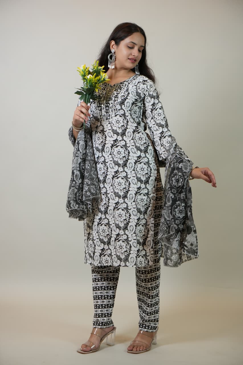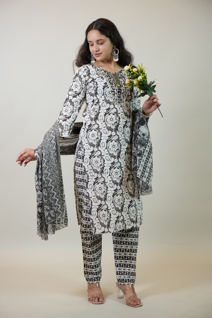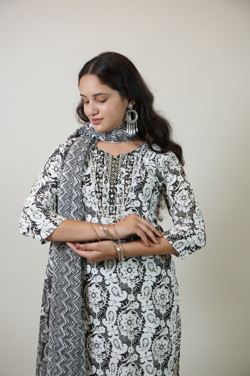 Elevate your ethnic wardrobe with this elegant women’s black & white floral printed kurta set. Designed in breathable cotton fabric, this kurta features a straight cut with intricate floral and paisley prints, paired with a matching printed pant and a beautifully patterned dupatta. Perfect for everyday wear, office looks, or festive gatherings, this kurta set combines comfort with style. Pair it with statement earrings and heels to complete your traditional look.