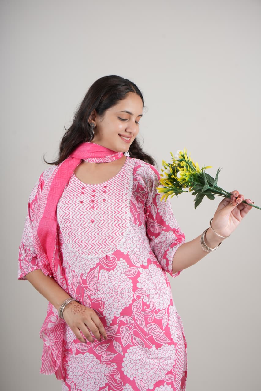 Step into elegance with this light pink floral printed cotton kurta set for women. The kurta features a round neckline with delicate detailing, paired with zig-zag printed pants and a beautifully patterned dupatta. Crafted from soft breathable cotton, this outfit ensures all-day comfort while keeping your ethnic style fresh and trendy. Perfect for casual outings, festive gatherings, and office wear, this kurta set adds charm and sophistication to your wardrobe. Pair it with silver jhumkas and heels for a graceful traditional look.