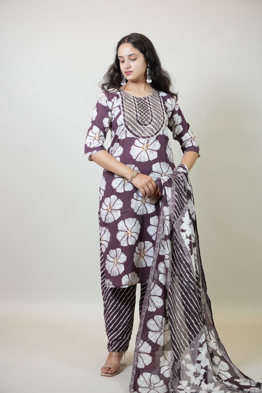 Refresh your ethnic collection with this maroon floral printed cotton kurta set for women. The straight kurta comes with bold white floral patterns, a beautifully detailed yoke design, and is paired with striped pants for a modern ethnic vibe. The lightweight printed dupatta completes the look, making it perfect for both casual and festive occasions. Crafted in breathable cotton, this kurta set ensures comfort with style. Pair it with ethnic jhumkas and heels for a classy finish.